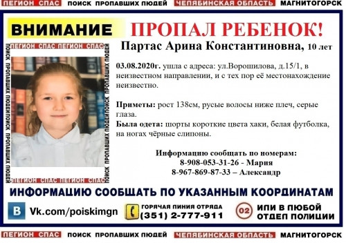 10-летняя Арина Партас 3 августа ушла из дома по адресу: Ворошилова, 15/1. С тех пор ее местонахождение неизвестно.