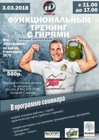3 марта в ФЦ «Платформа» желающие смогут принять участие в семинаре «Функциональный тренинг с гирями». Семинар проведет Заслуженный мастер спорта России, десятикратный чемпион мира, абсолютный рекордсмен мира во всех дисциплинах гиревого спорта Иван Денисов.