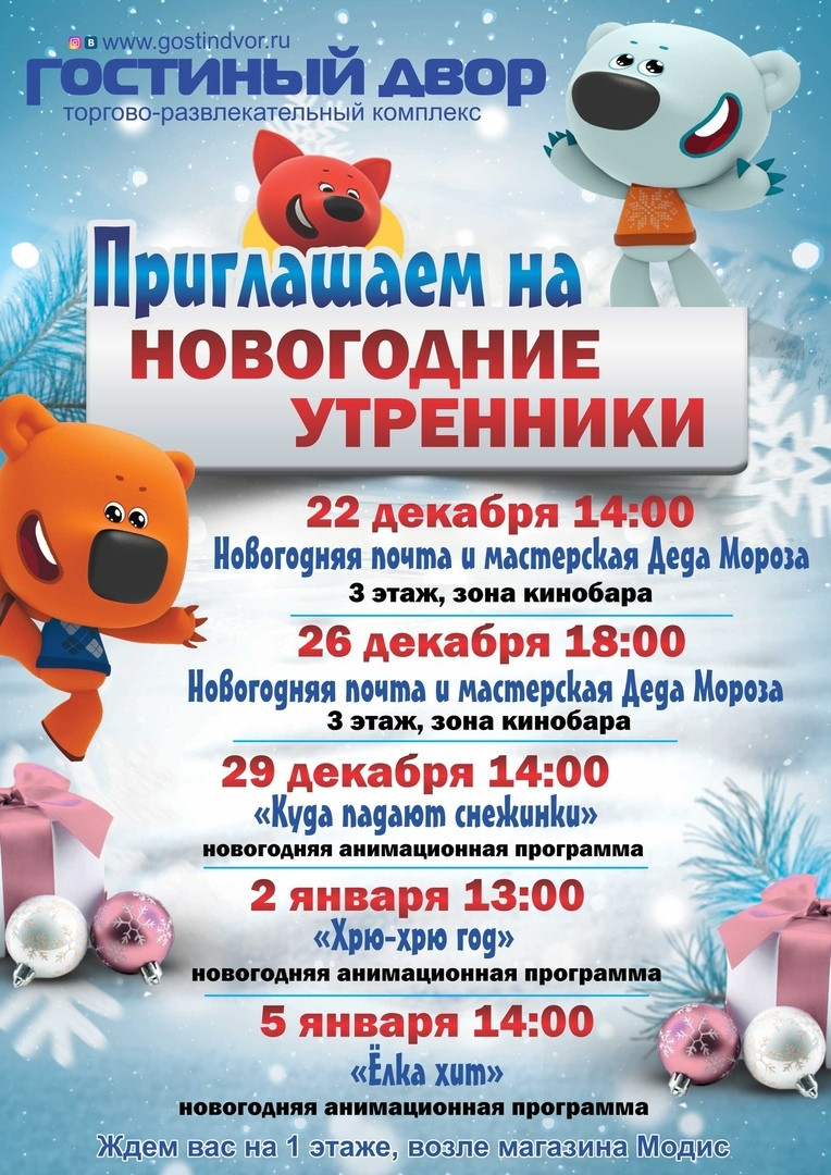 29-го декабря горожане могут прийти на анимационную детскую программу «Куда падают снежинки», 2-го января на шоу «Хрю-хрю год»;
