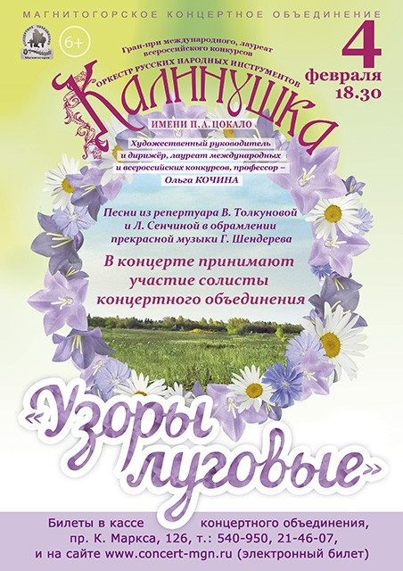 4 февраля в 18:30 приглашаем вас в наш зал на концерт оркестра русских народных инструментов «Калинушка» и солисток МКО Юлии Винидиктовой, Ирины Лукашенко и Татьяны Шмелевой. В программе прозвучат произведения советских композиторов и сюита Г. Шендерева «Узоры луговые».