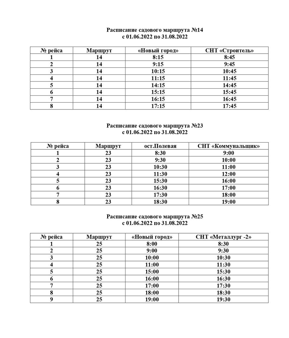 На обслуживании всех садовых некоммерческих товариществ, расположенных в границах города, задействованы автобусы как большого, среднего, так и малого классов. Отправляются автобусы от остановок «Рынок "Радуга вкуса"», «Рынок "Новый город"», «Художественная школа», «Полевая», «Площадь Привокзальная».