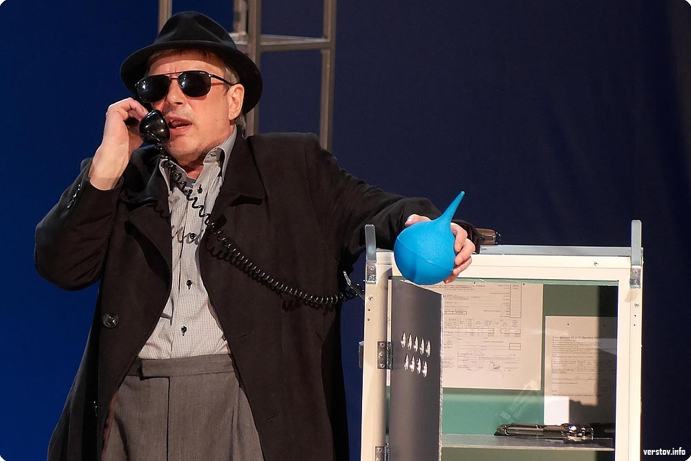 Действие спектакля захватывает зрителей уже при входе в зал. Встречающие молодые охранники с автоматами проверяют всех с помощью металлоискателей. На сцене на экране большого кинопроектора - табло аэропорта. Затем те же декорации становятся квартирой 82-летнего миллионера Гарри, разговаривающего по телефону с клизмой в руках...