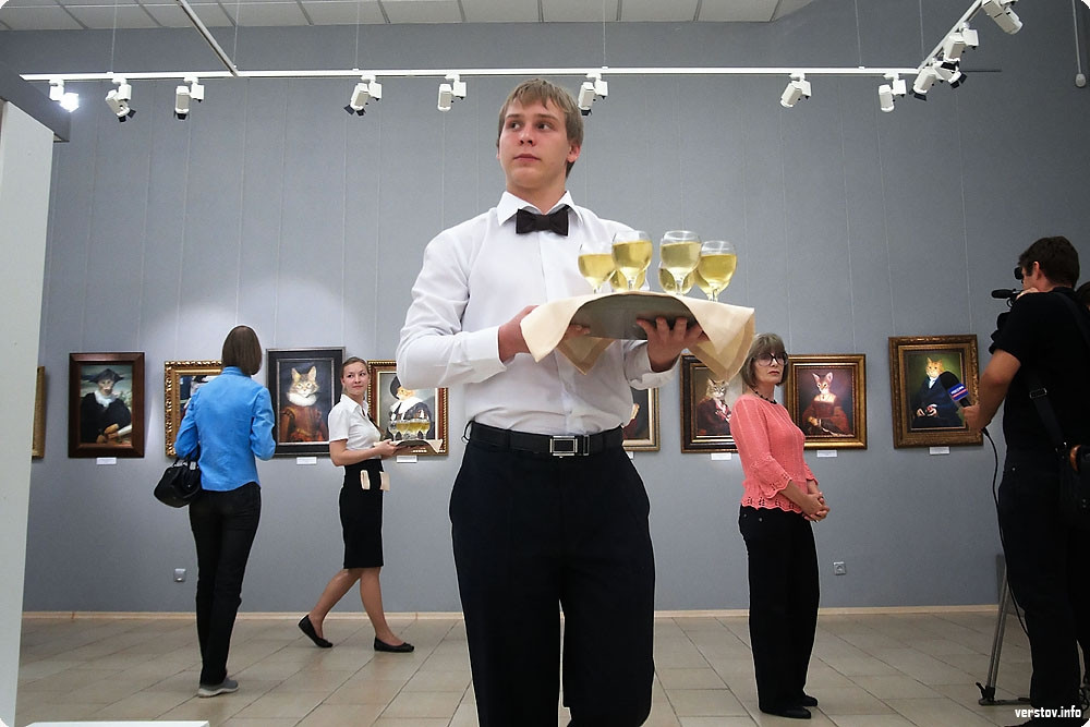 Официально выставка начинает работу 8 августа, накануне же работы Сафронова были представлены журналистам и приглашенным гостям, которых ждал фуршет с шампанским по случаю столь важного события.