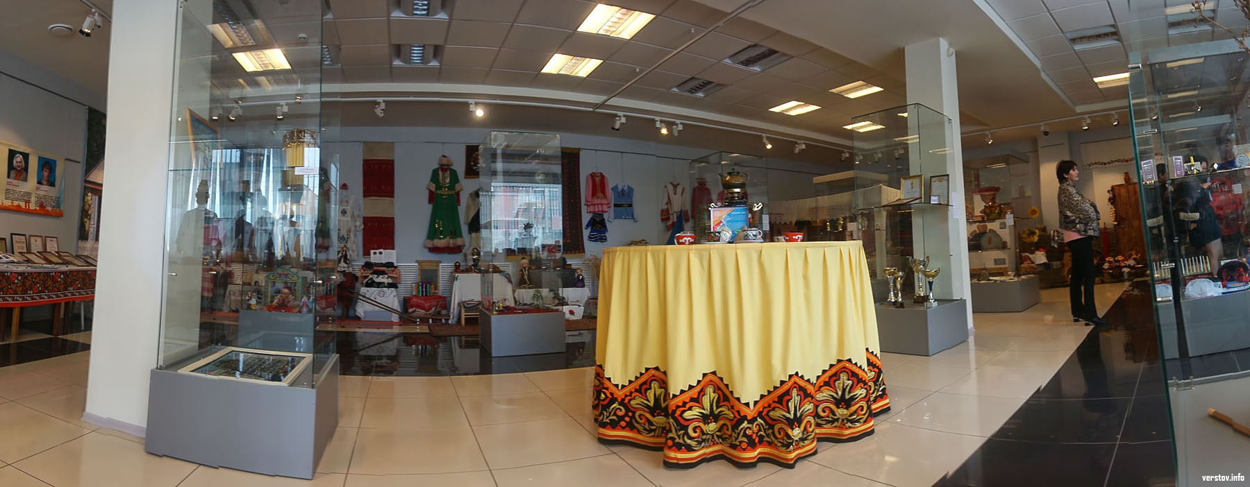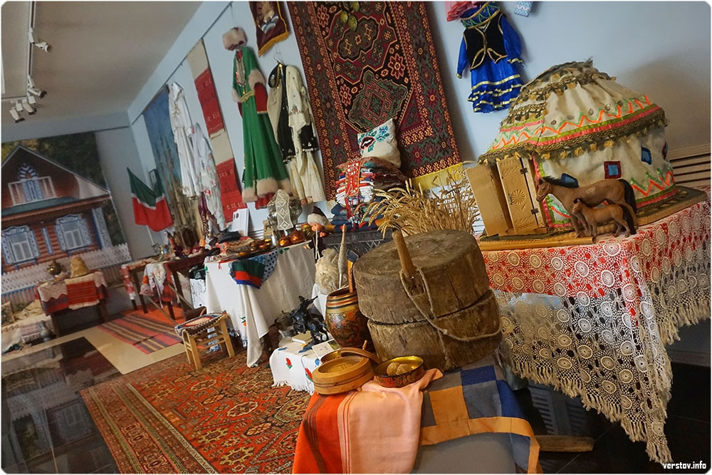 Для третьеклассников школы №9 экскурсию проводила художник Дома дружбы народов Елена Окунева. Зал декоративно-прикладного искусства до 15 октября превратился в большой «дом», комнаты в котором подготовили национальные отделы Дома дружбы. Первая «комната» - общая: рассказывает об истории создания учреждения, его руководителях и достижениях. Слева от входа — экспозиция татарского и башкирского отделов. Здесь представлено традиционное убранство, национальные инструменты, вышивки, рушники, национальные татарские и башкирские костюмы. За стеклом — настоящие сокровища — Кораны. Один датирован 1889 годом, другой — 1814. Рядом — старинные четки.