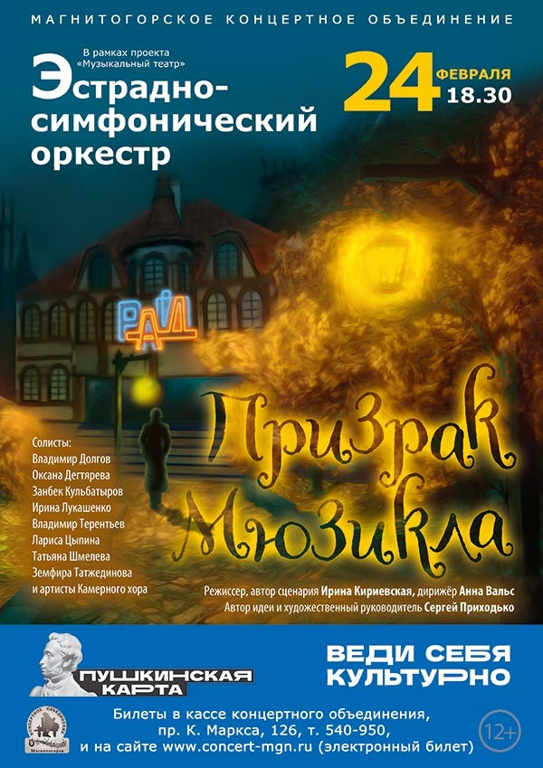 Эстрадно-симфонический оркестр под руководством Сергея Приходько, дирижер Анна Вальс, солисты и Камерный хор Концертного объединения представляют концерт под названием «Призрак мюзикла». Начало в 18:30 24 и 25 февраля.