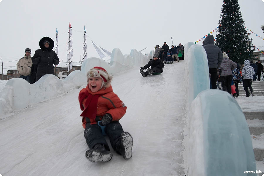 Наши эксперты бросают на бегу «все клёво», и бегут на другую горку, почему-то не залитую. Несмотря на то, что кататься детям приходится, внимание, на деревянной горке, которая тормозит и, по нашему мнению, лишает всяких «горочных» ощущений, Эмиль и Егор совершают штук 10 заходов на «Эльбрус». Останавливаются только когда мы обещаем «о-о-очень большую горку на Курантах».