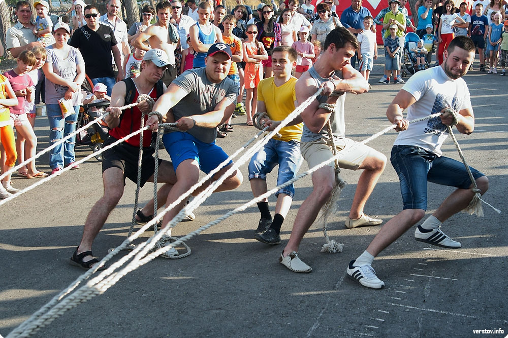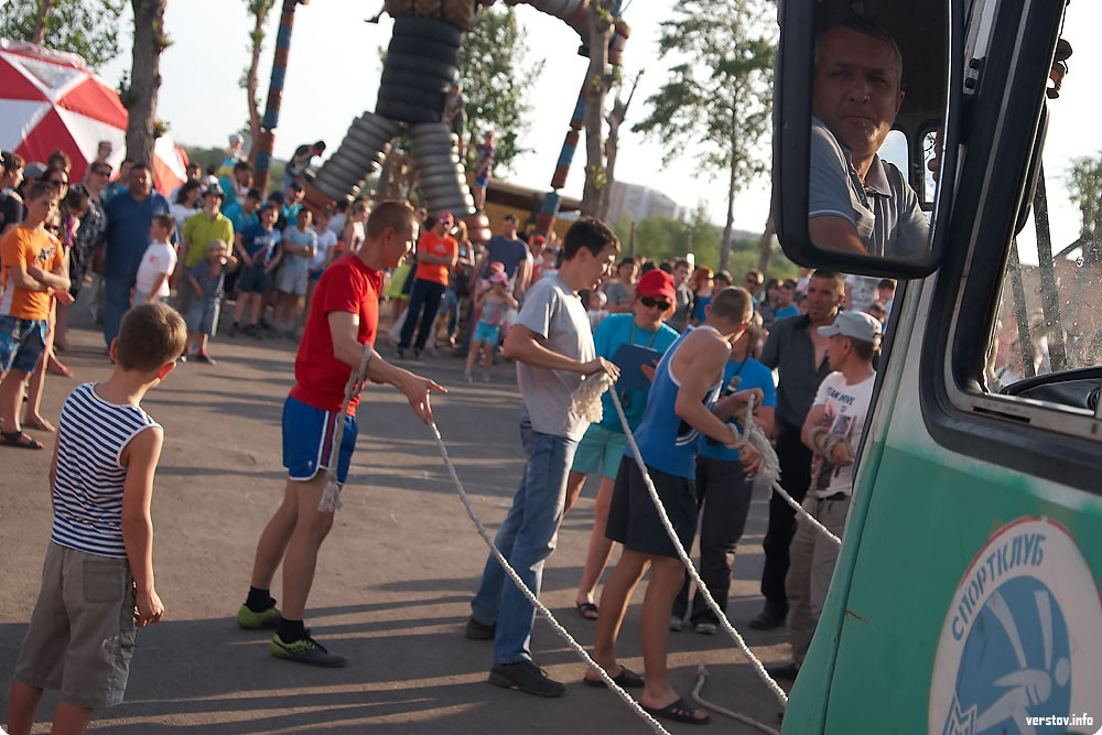Отстояв очередь за освежающим лимонадом и отпустив младшего ребенка развлекаться в «песочнице» - площадке для пляжного волейбола, наш корреспондент отправился со старшим изучать окрестности бывшей лодочной станции. Внимание сразу привлек пятитонный «Пазик», к которому было привязано несколько канатов. Маленькие карапузы и ребятишки постарше безуспешно пытались тянуть автобус, стоящий на ручнике. Подошла компания подростков и спросила, дадут ли им призы, если они сдвинут автобус с места. Тут же в микрофон инструктор объявила о начале соревнований по перетягиванию автобуса. На них изначально никто не записывался, команды набирались стихийно. Для официальных состязаний автобус с тормозов, разумеется, сняли и даже завели, так что прокатить его несколько метров для пяти здоровых мужчин оказалось проще простого. Оставалось выяснить, у кого это получится сделать быстрее.