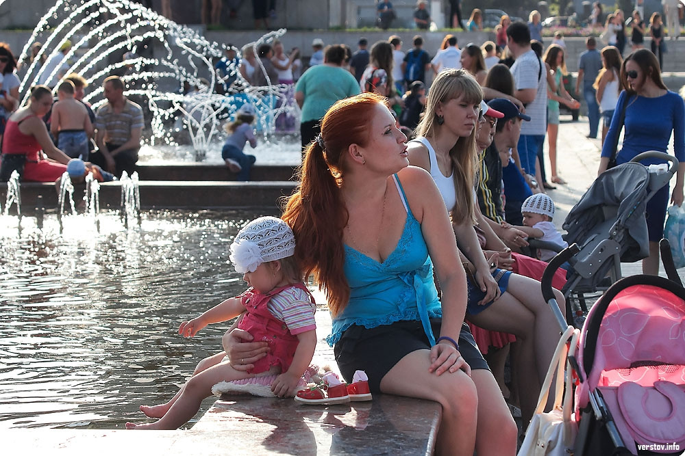 Ближе к 17:00, когда должна была начаться официальная часть праздника, территория вокруг курантов не была заполнена и наполовину. Вероятно, магнитогорцев смутила жара, к которой вскоре присоединился неприятный и привычный запах куриного помета. Но около тысячи человек все-таки набралось, в основной массе старшие школьники и родители с маленькими детьми. В полную силу заработали все площадки: и танцевальная, и спортивная, и дартс, и некоторые спонсорские придумки, и хенд мейд... Едва ли не все, чем живет современная Магнитка, было представлено на площади.
