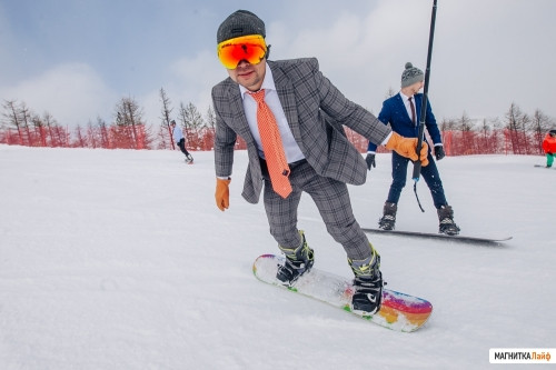 На трассу вышли около десятка любителей сноубординга, которые были одеты в строгие костюмы. Пиджаки и галстуки стали главным атрибутом флешмоба. Многие гости ГЛЦ были, мягко говоря, озадачены.