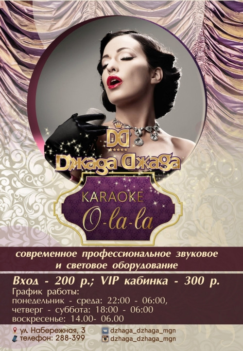 А также спешим порадовать всех любителей караоке! Теперь караоке-клуб O-LA-LA в РК «Джага-Джага» работает в 2 раза больше!