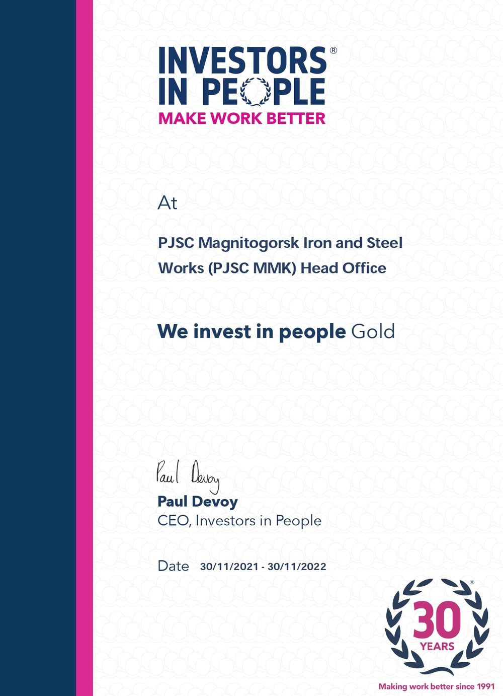 2021 год стал первым, когда ММК подал заявку для аккредитации в Investors in People, и компания с первой попытки завоевала «золотой» статус, минуя «стандарт» и «серебро», что свидетельствует об очень высоком качестве кадровой работы. На данный момент ММК – единственная крупная отечественная компания, удостоенная аккредитации Investors in People, тем более в «золотом» статусе. Ранее на территории России аккредитацией IIP обладали только иностранные предприятия.