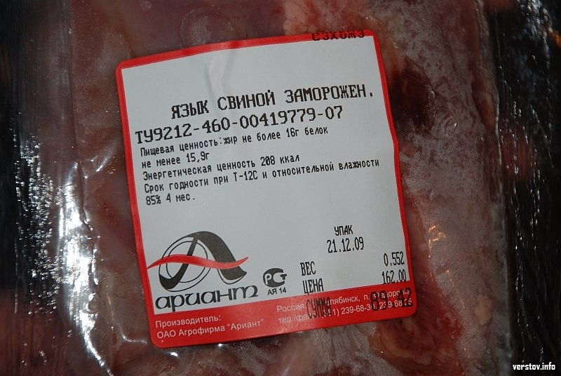 Эти фотографии Магнитогорскому информационному агентству 20 декабря предоставила читательница, которая дома решила проверить, не просрочен ли свиной язык, купленный в магазине «Ариант» по улице Жукова, 1. Удивлению не было предела, когда выяснилось, что она купила полуфабрикат, который упакуют только… завтра! Более того, покупательница рассказала, что со слов продавца, свежие продукты им завозят два раза в неделю: по понедельникам и четвергам. Выходит, что и 18-го, и 19-го, и 20-го декабря в фирменном магазине можно купить товар, на котором черным по белому написано: «Упаковано 21.12.09». Такая свежесть достойна Книги рекордов Гиннеса.