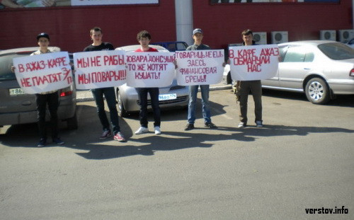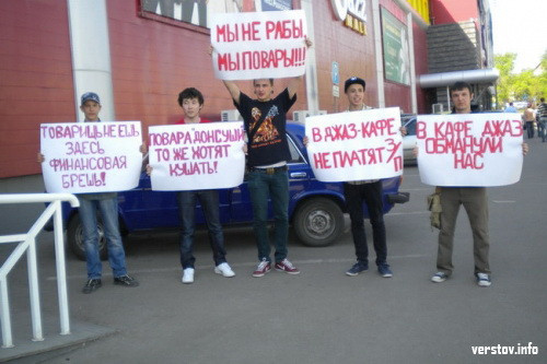 Но повара и остальные сотрудники кафе уже не верят, что словами можно что-то решить. Поэтому финальный аккорд – пикет с плакатами возле «Джаз-молла». Причем, пикет быстрый – охрана не спит…