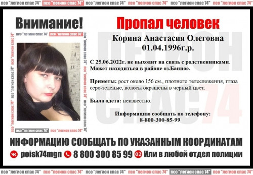 26-летняя Анастасия Корина с 25 июня не выходит на связь с родственниками. Может находиться в районе озера Банного.