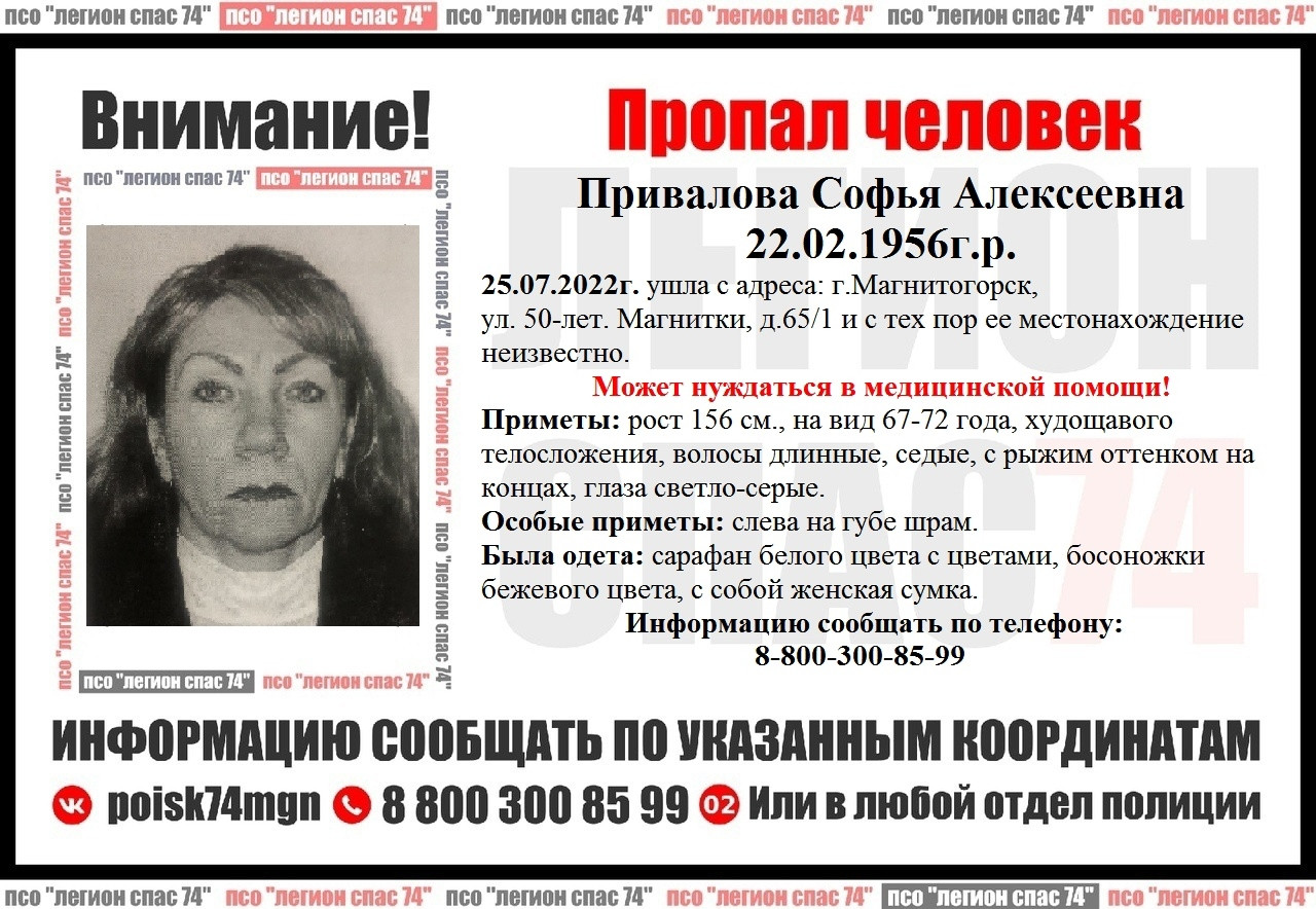 66-летняя Софья Привалова еще в прошлый понедельник, 25 июля, ушла из дома по адресу ул. 50-летия Магнитки, 65/1. С тех пор её местонахождение неизвестно. Женщина может нуждаться в медицинской помощи.