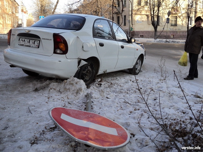В результате столкновения «Шевроле» вылетел на тротуар, на котором, по счастью, не было в этот момент пешеходов, напрочь снеся знак, запрещающий сквозной проезд. «Шевроле» крепко досталось – водительскую дверь помогли открыть парни, проходившие мимо.