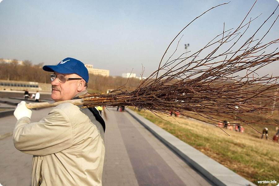 В 9 часов утра сельхозинвентарем вооружились порядка 200 человек. Депутаты, сотрудники аппарата МГСД и общественники обосновались у монумента «Тыл-Фронту», чиновники же во главе с градоначальником взялись за сквер Трех поколений. Из депутатов городского Собрания был один только Дмитрий Мельников, добросовестно убиравший лопатой мусор, да депутат ГосДумы Алексей Бобраков, воевавший с разваливавшейся от дуновения ветра метлой.