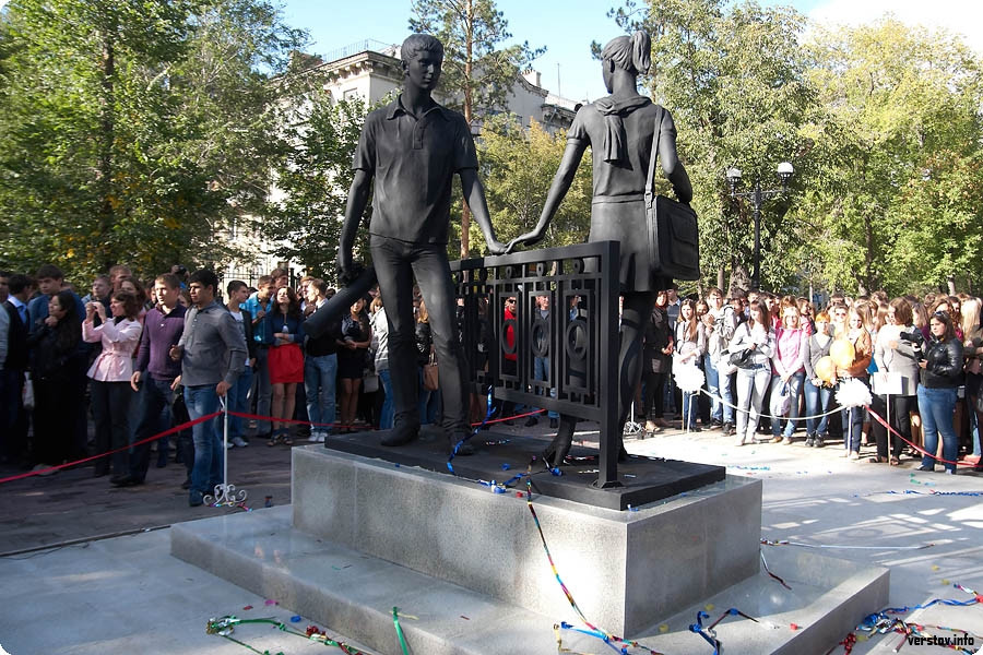 Перерезав традиционную красную ленточку, ВИПы «на счастье» подержались за разные части скульптуры: Александр Морозов за тубус для чертежей и, задумчиво, за руку скульптурной девушки, Александр Дерунов дотронулся до руки чугунного студента, а Евгению Тефтелеву тоже больше всего приглянулся чугунный тубус. Предложивший стать начинателями этой традиции Иван Сеничев, «на счастье» дотронулся до чугунной оградки, разделяющей скульптурных студентов.