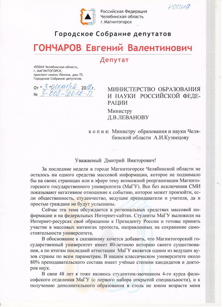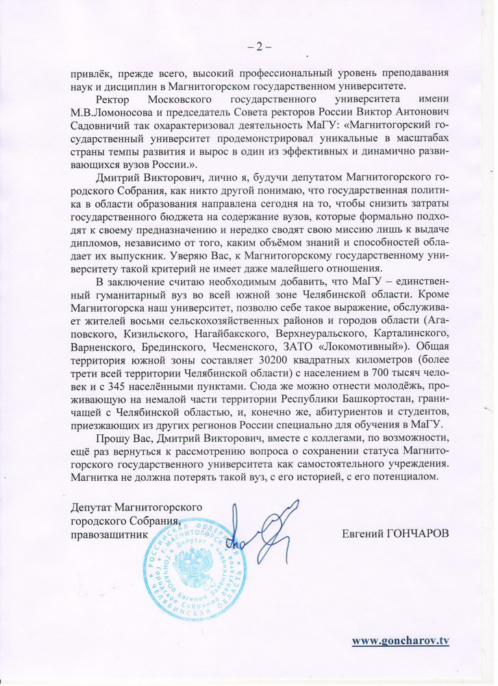 Магнитогорск. Депутат Магнитогорского горсобрания Евгений Гончаров направил в адрес Министра образования и науки РФ Дмитрия Ливанова письмо с просьбой пересмотреть выводы о реорганизации Магнитогорского государственного университета.