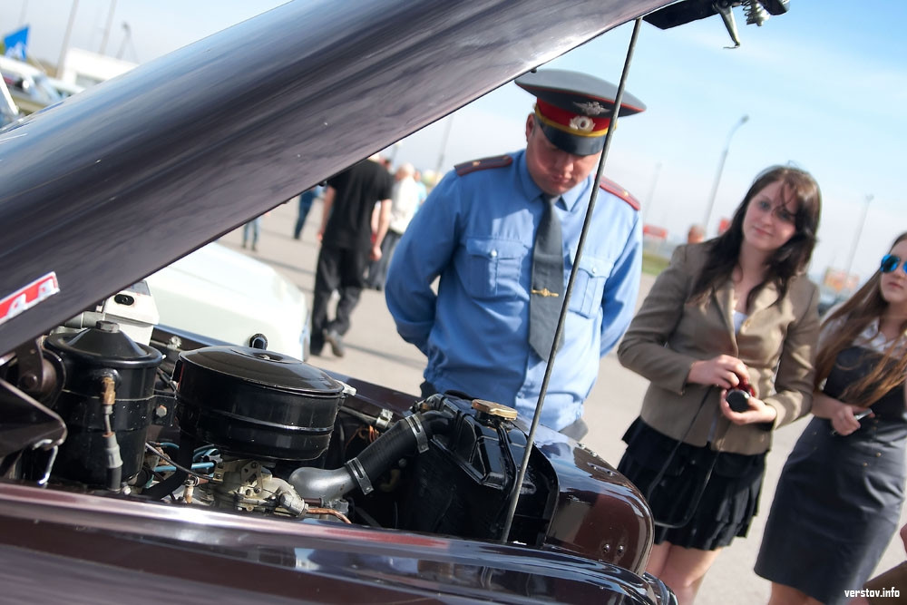 Ровно в одиннадцать сотрудник ГИБДД собирает автолюбителей в круг, где объясняет правила дорожного движения для ретро-колонны: едем сорок-пятьдесят километров в час по двое, на красный можно, только если сами гаишники проезжают на красный. Если вдруг загорается во время кортежа запрещающий сигнал светофора, не останавливаться.