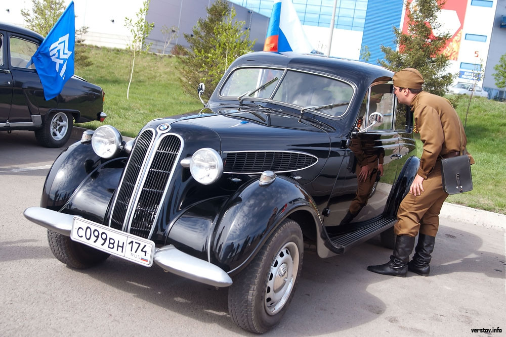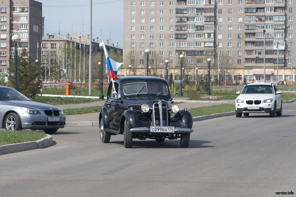 Сбор автомобилистов проходил уже традиционно за «Ареной Металлург». Преимущественно автолюбители приехали на послевоенных отечественных машинах и мотоциклах – в основном «Победы», «ГАЗ» и «ВАЗ-2101». Но были и те, кто приехал на «трофейных лошадках», например, Сергей Бобров на стареньком BMW. Сергей восстановил машину практически из ничего, нашел её ржавую в одном из гаражей города, отреставрировал и вот уже несколько лет катается на ней по городу. Правда, редко – нужен повод, такой как ретро-автопробег, посвященный Победе. А то, что немецкая, не страшно – «трофейная» же…