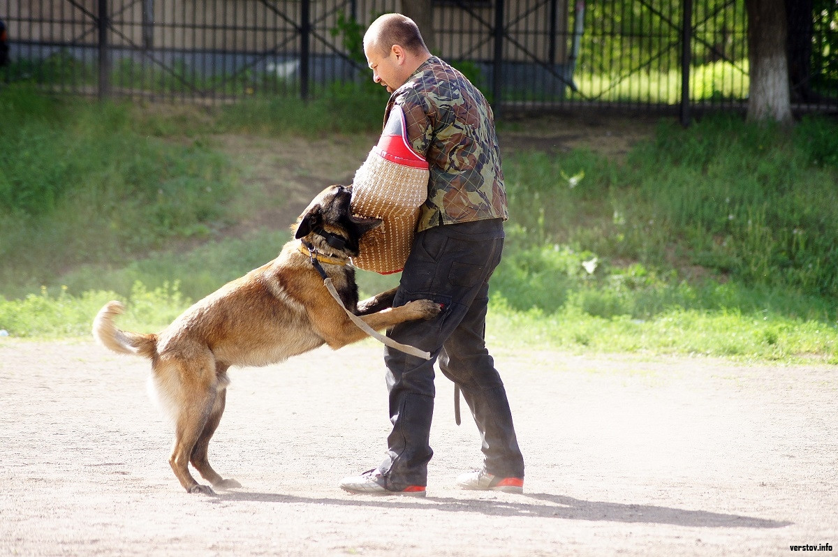 Итак, вот только что собаки мирно лежали в травке рядом с совсем маленькими детьми и тут вдруг подняли лай, напряглись. Оказывается, Алексей надел специальный рукав, который спасает его от страшных собачьих зубов и служит для них основной мишенью. По команде хозяйки первым сорвался с места трёхлетний кобель бельгийской овчарки. Приличное расстояние он преодолел за секунду, почти свалив Алексея с ног. Собака вцепилась в рукав и не реагировала ни на специальную дубинку, ни на крики. Остановилась она только после очередной команды хозяйки, уйдя «в засаду» - не спуская глаз с жертвы, готовясь после любой провокации вновь вцепиться в добычу.