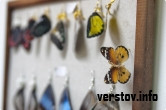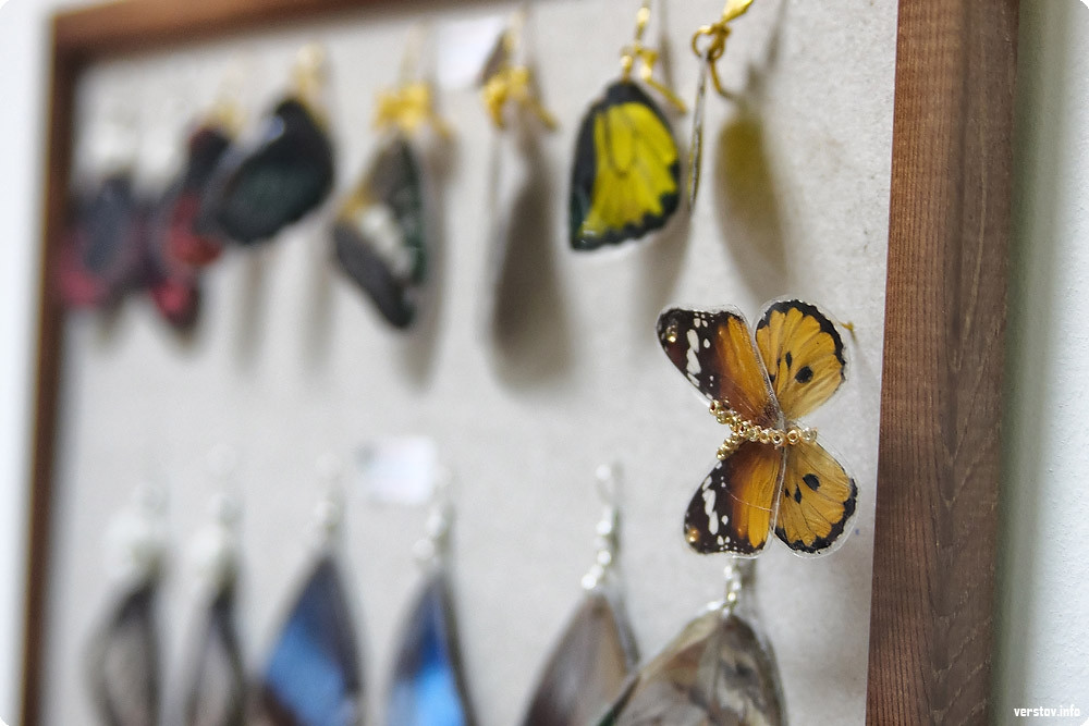 Предвосхищая вопрос о том, куда отправляются почившие бабочки, девушка показывает несколько панно. Все картины выполнены с использованием разноцветных крылышек. На отдельном стенде – волшебной красоты серьги, также исполненные из отлетавших свое насекомых.