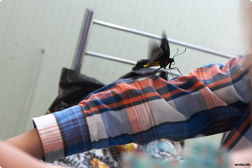 Дети в восторге от летающих красавиц. Они достают телефоны, планшеты и наперебой с ними фотографируются. «Вот смотри, я сейчас спокойна и поэтому у меня бабочка сидит на руке. А если бы я нервничала, бабочка тут же улетела бы», - делится полученными знаниями одна из девочек со своей подружкой. Многие просят Екатерину поймать сачком «вон ту, зеленую, с желтыми ободками на крыльях», чтобы разглядеть ее поближе. Другие затаивают дыхание, боясь спугнуть сидящую на руке тропическую красавицу.