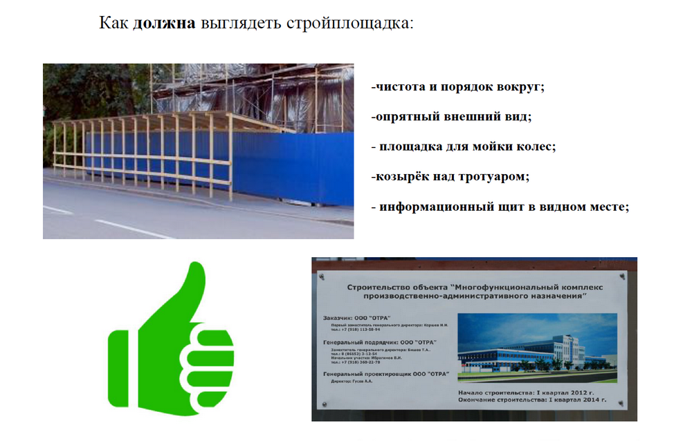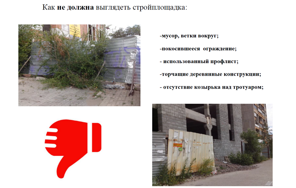 Еще один обязательный пункт – уборка прилегающей к участку территории. Она должна быть свободна от строительного и любого другого мусора, зарослей. На совещании представителям малого и среднего бизнеса продемонстрировали снимки принадлежащих им объектов строительства, демонстрирующие их недобросовестное отношение к своим обязательствам.