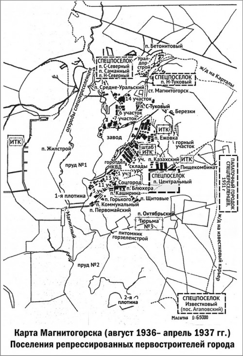 В процессе исследований карта была существенно переработана автором. Теперь на ней указаны все четыре спецпоселка (Центральный, Северный, Ново-Туковый и Известковый). Через них с 1931-го по 1948-й годы прошло более 50 тысяч ссыльных, ранее раскулаченных вместе с семьями. Наибольшей концентрации на магнитогорской стройплощадке спецпереселенцы достигли к 1 октября 1931 года, когда их численность достигала 42,5 тыс. человек. Также обозначено местоположение довольно большого палаточного городка спецпереселенцев, существовавшего с весны по осень того же года. На карте видно, что Центральный спецпоселок граничит с Казахским поселком. Здесь в 1933-1935 годах проживало несколько тысяч казахов, привезенных в Магнитогорск с целью их ускоренной «перековки» из кочевого народа в оседлый, а, значит, приспособленный более успешно развиваться в условиях нового «социалистического» общества.