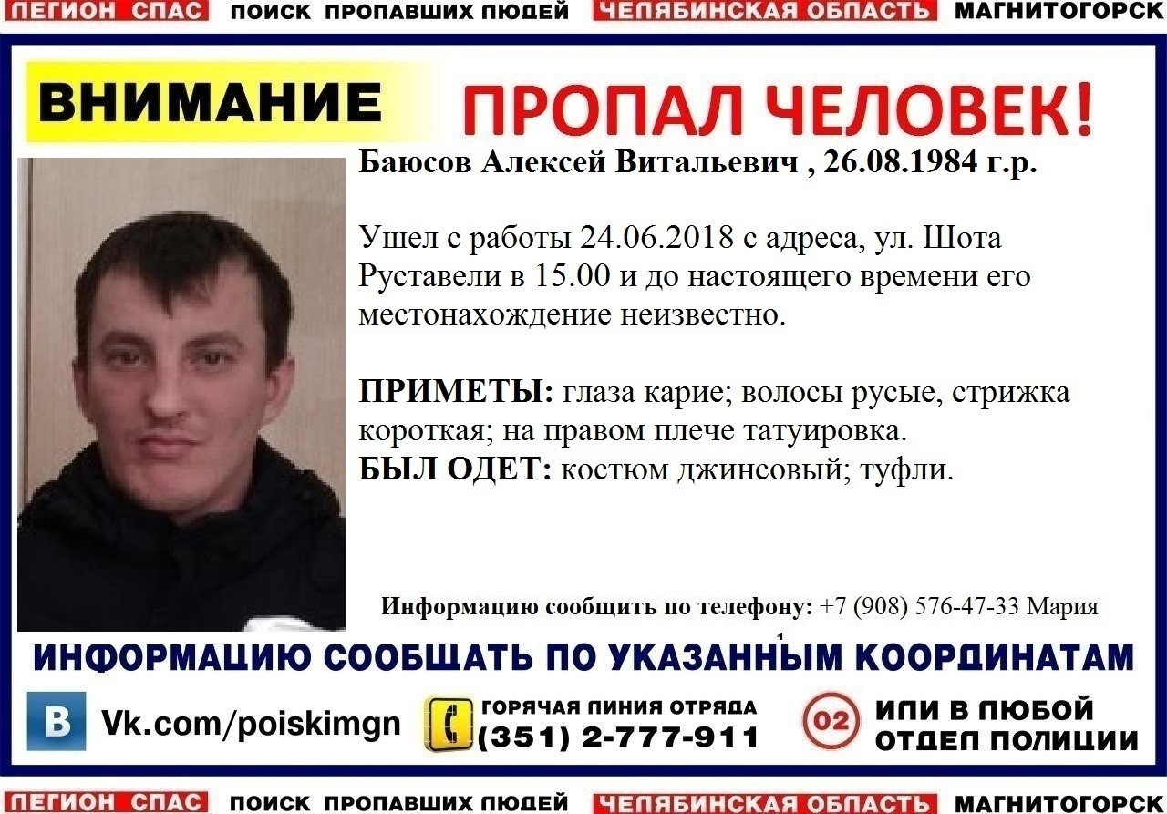 33-летний Алексей Баюсов пропал 24 июня. В тот день он ушел с работы и до настоящего времени его местонахождение неизвестно. В последний раз его видели на улице Ш. Руставели.