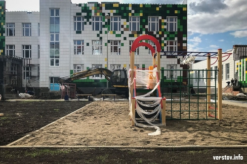 Тем временем, идёт монтаж игровых элементов на детских площадках. Уже установленные горки и качели еще завёрнуты в плёнку. Ученикам новой школы точно не будет грустно на переменах. С западной стороны появилась баскетбольная площадка, а также еще несколько спортивных объектов.