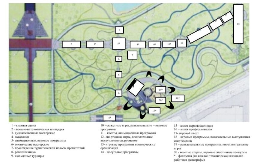 В субботу, 1 сентября, парк превратится в настоящий город развлечений. На его территории появятся два десятка площадок на любой вкус. Будет работать военно-патриотическая зона, художественные мастерские, площадка для автогонок. Первоклассники смогут пройти полосу препятствий, попробовать себя в робототехнике и шахматах, принять участие в анимационных и игровых программах, а также квестах и спортивных играх.