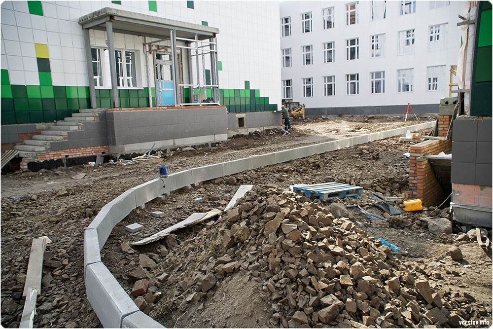 В новой трехэтажной школе на 825 мест будет два основных входа. Главный – со стороны улицы Советской и крытого катка «Умка» – почти закончен. На крыльце завершаются отделочные работы, снаружи практически закончено благоустройство. Но обход начался с другой стороны – со стороны входа для начальной школы.