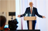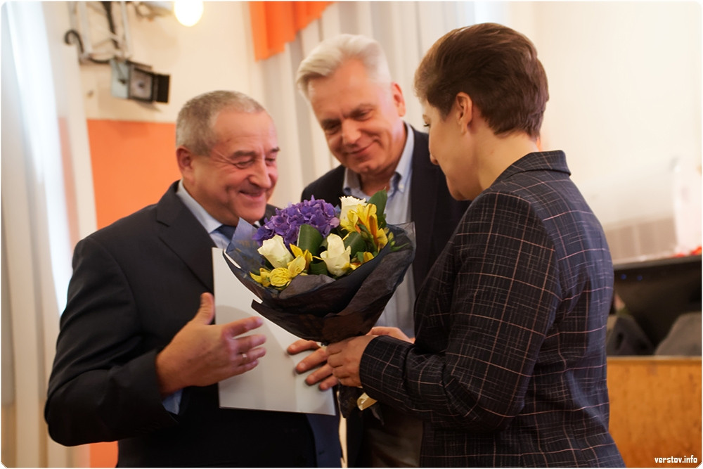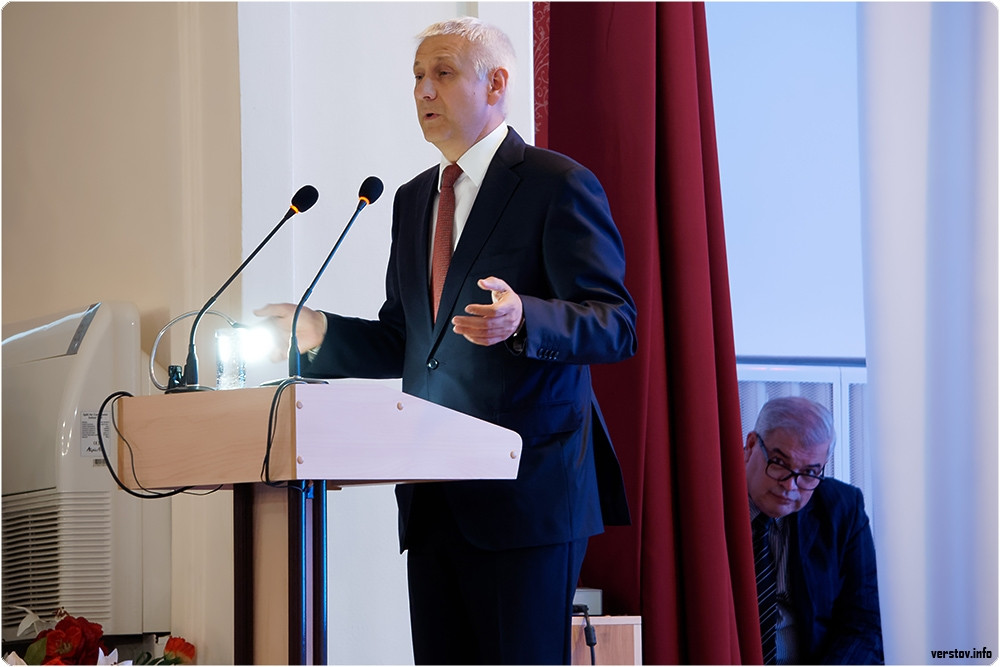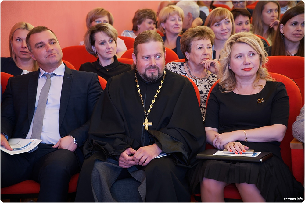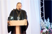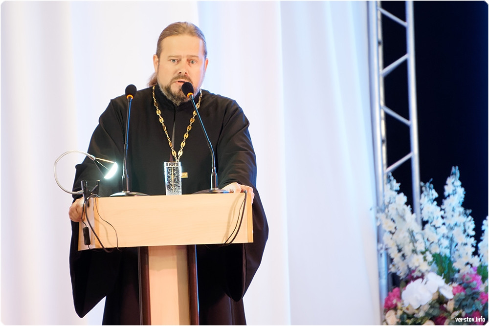 После Сергея Бердникова на сцену с поздравлениями поднялись спикер МГСД Александр Морозов и руководитель отдела религиозного образования и катехизации Магнитогорской епархии, протоиерей Андрей Иващук.