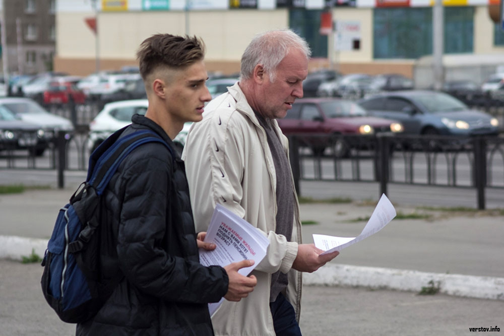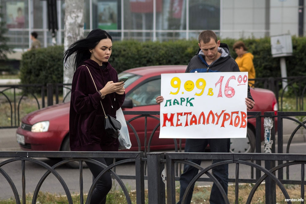 Отметим, что пикетчики никого не призывали прийти на акцию. По факту, они лишь развернули плакаты, на которых было написано: «Парк Металлургов. 9.09. 16:00. Акция против пенсионной реформы». Кроме того, на верхней одежде молодых людей были прикреплены значки «Без меня!».