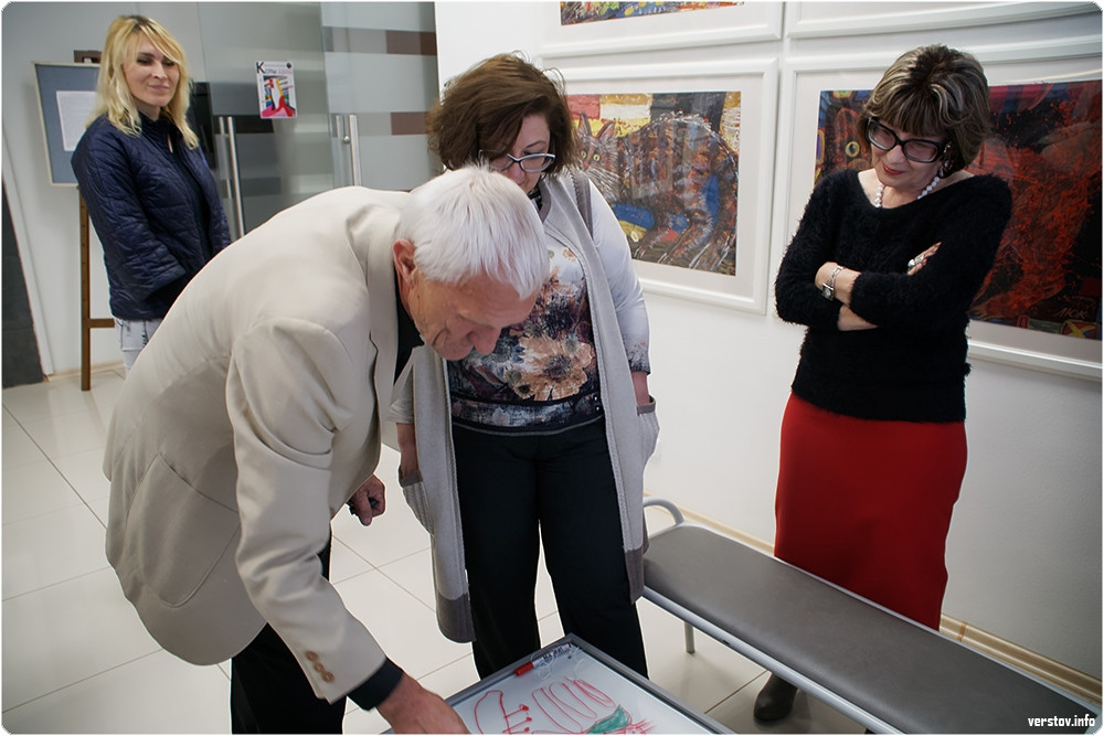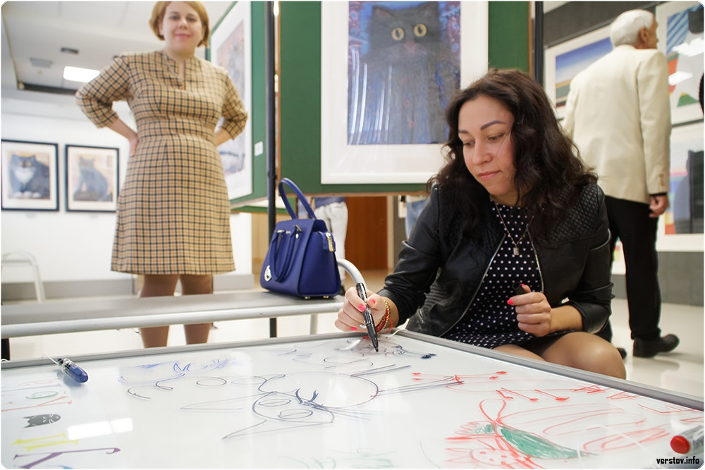 А самые активные зрители, пришедшие на выставку в Магнитогорскую картинную галерею, смогут на интерактивной доске нарисовать своего кота, который станет полноправным участником экспозиции. Так на открытии выставки Юрия Люкшина одним из авторов-создателей «магнитогорского друга для питерских пушистиков» стал член Союза художников России Олег Базылев.