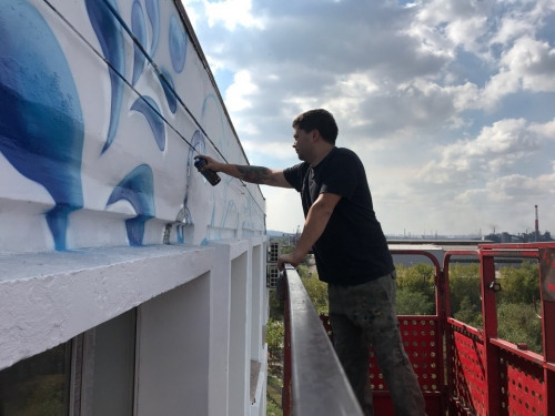 Котлованов и Платонов украсили очередным своим творением фасад главного здания ОАО «Прокатмонтаж». Напомним, это уже не первый опыт сотрудничества художников и магнитогорской компании. Ранее мастера граффити на одном из фасадов нарисовали пейзаж, а на другом - сказочный замок.
