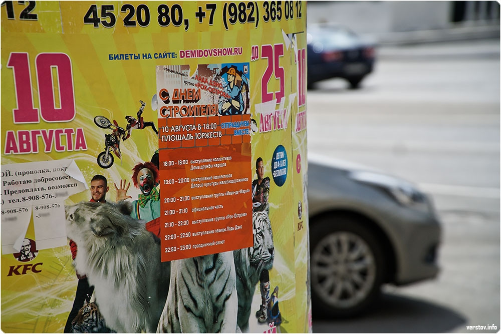 Справедливости ради отметим, что афиши гастролирующего в Магнитогорске цирка-шапито вполне себе активно расклеивались и на афишных тумбах. Впрочем, через некоторое время они оказывались заклеены другой рекламной продукцией, в том числе и анонсом праздничных гуляний на День строителя, которые проходили на площади у городской администрации. Возможно, циркачи хотели, чтобы их афиши подольше провисели, поэтому расклейщики переключились на остановочные комплексы. Это, конечно, ни в коем случае не оправдывает поведение нарушителей.