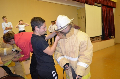 Небольшое соревнование между учениками стало главной изюминкой мероприятия. От каждого класса приняли участие по юноше и по девушке. Главная задача каждой пары – надеть специальную одежду правильно и за короткий промежуток времени. Но так как пожарный никогда не работает один, то ученикам предстояло показать то, как они работают в команде, то есть один надевает, а другой – помогает. Отметим, что в мероприятии приняли участие около 200 учащихся.