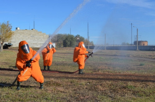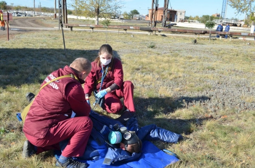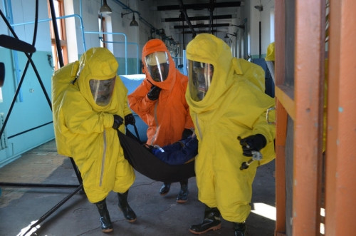 Приехавшие пожарные, надев специальные защитные костюмы, которые позволяют находиться на зараженной территории и даже в зоне радиации, делятся на два звена. Первое звено устраивает боевое развертывание и орошает территорию водой, чтобы хлор не смог распространиться дальше. Второе – отправляется на помощь к пострадавшим. Одного сотрудника станции нашли в помещении, мужчина находился без сознания. Огнеборцы вынесли работника на носилках и передали медикам.