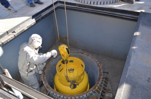 Для этого, на поврежденную капсулу надевают защитный хомут, с помощью специального механизма капсулу поднимают с земли, опускают ее в футляр для аварийного вырабатывания неисправных контейнеров, который находится глубоко в земле, стены и пол углубления забетонированы. Футляр плотно закрывается крышкой.