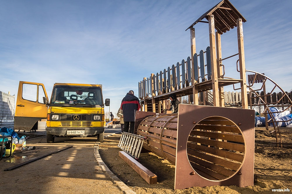 На данный момент питерский подрядчик завез все необходимое оборудование и уже начал монтаж. Отметим, что конструкции устанавливают на совесть – забиты сваи, что говорит о том, что весной во время таяния снега детский комплекс точно не поплывет. Основные части будущей площадки уже стоят – это башни и переходы. Стоит добавить, что было решено отказаться от «клоунской» расцветки, поэтому все конструкции площадки сделали под цвет дерева.