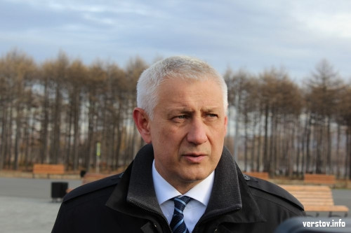 Перед появлением градоначальника директор МАУ «Парки Магнитки» Александр Россол рассказал журналистам о ближайших планах по благоустройству парка. Оказалось, что в знаковом месте города уже высадили не один десяток молодых берез, за которыми, кстати, ежедневно ухаживают. Также он рассказал, что планируется высадить еще 20 елей.