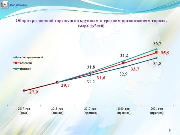 Отдельно Макарова остановилась на прогнозировании производственных показателей. Основой здесь послужили показатели крупнейших предприятий города, доля которых составляет 91% от общего объёма отгруженной продукции, выполненных работ и оказанных услуг. Здесь при любом варианте развития планируется ежегодный рост объёмов. Во многом его будет обеспечивать стабильная работа ПАО «ММК», доля которого превышает 75%.