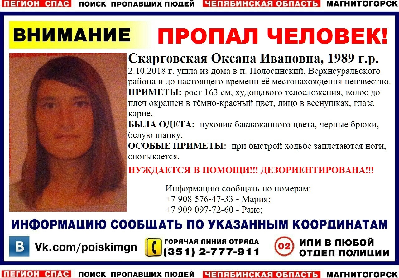 29-летняя Оксана Скарговская пропала еще 2 октября. В тот день она ушла из дома в поселке Полосинский Верхнеуральского района. До сих пор не известно, где она находится и что с ней случилось.