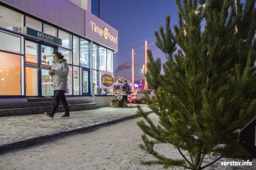 На перекрестке проспекта Карла Маркса и улицы Завенягина елочный базар находится сразу в двух местах – у продуктового «Моста» и у торгово-развлекательного комплекса «Гостиный двор». Здесь пушистых красавиц так много, что у автомобилистов, наверное, возникают проблемы с обзором.