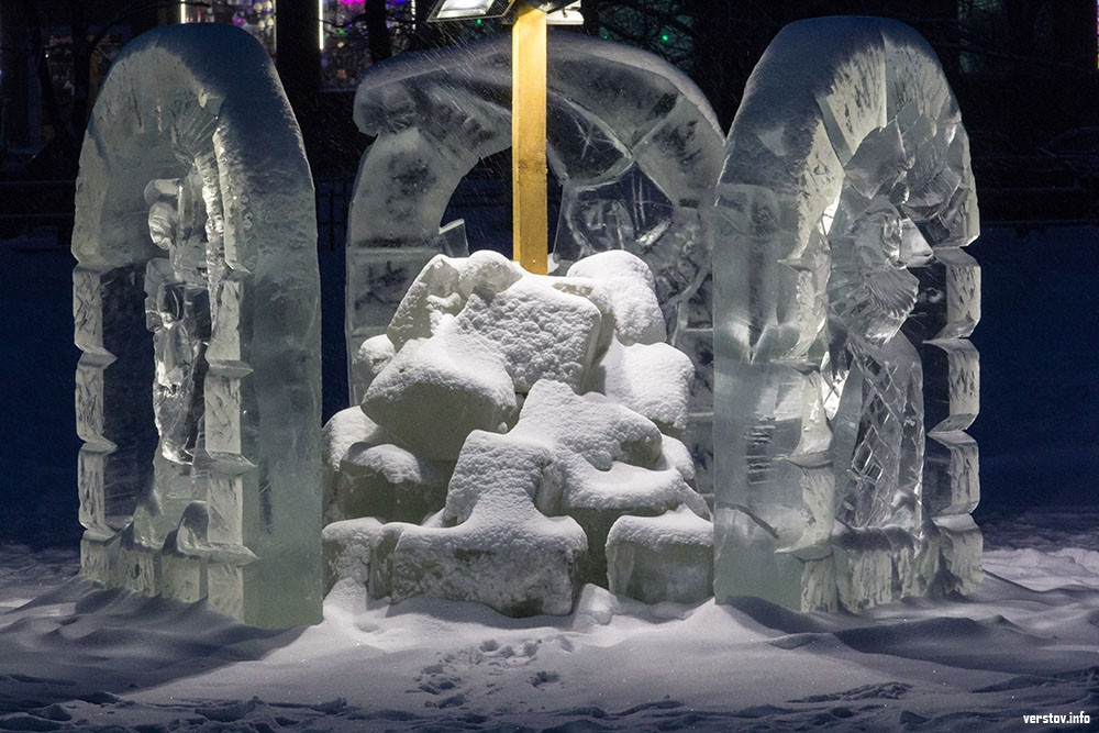 У каждого ледового районного городка своя тема. В сквере им. Б. Ручьева выбрали героев сказки Алексея Толстого «Золотой ключик, или Приключения Буратино». Из ледяных глыб скульпторы сделали папу Карло, лису Алису, кота Базилио и, конечно же, Буратино. Так же изо льда вырезали сердечки, слово «Город», городской герб и даже напоминание о предстоящем юбилее Магнитогорска – «90 лет». Естественно, не обошлось и без ледяной елочки и Деда Мороза со Снегурочкой.