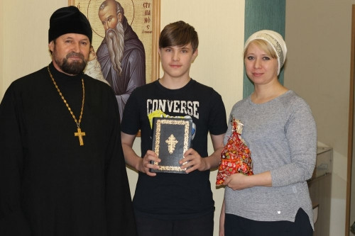 В коридоре у кабинета их уже ожидал отец Алексей. Батюшка привез подростку ценный подарок. Преосвященнейший Иннокентий епископ Магнитогорский и Верхнеуральский передал в дар школьнику намоленную Библию. Главную книгу всех христиан маме Юле и ее сыну батюшка вручил в больничной часовне иконы «Нечаянная радость».