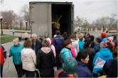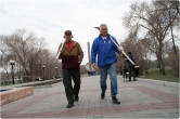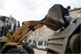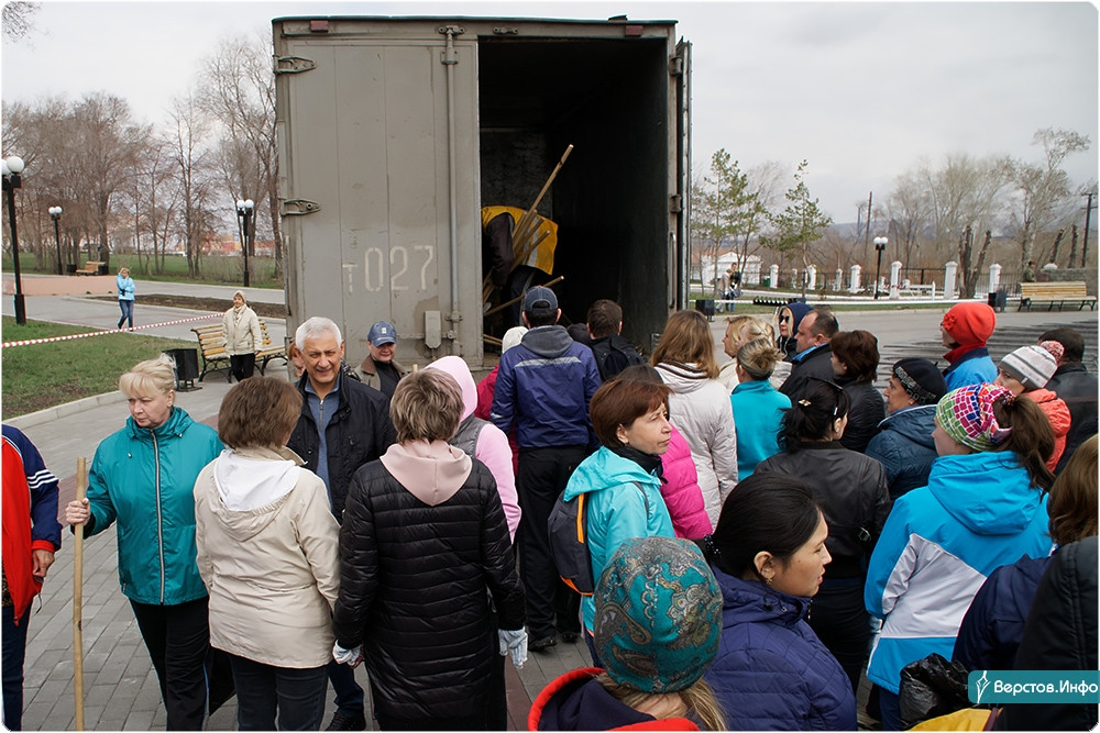Машина с граблями, метлами и лопатами, разгружавшаяся у стелы-фонтана, была окружена работниками администрации. Образовалась даже импровизированная очередь человек в 20-30 из желающих получить инструменты для уборки территории сквера. В этой очереди мы и заметили главу Магнитогорска - Сергея Бердникова.